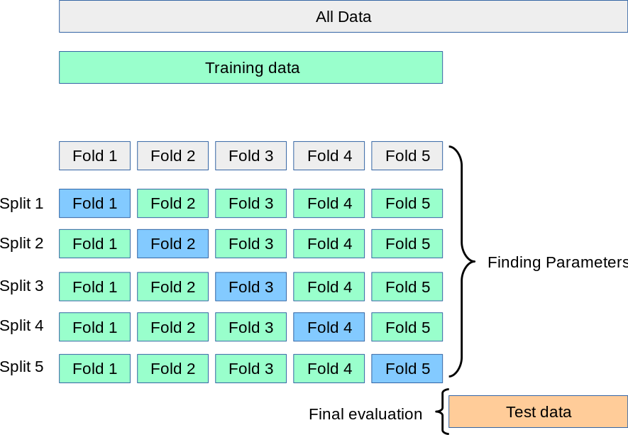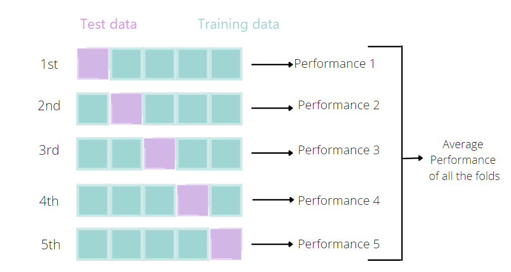 To solve this problem, we can calculate the average performance of model on iterative datasets. In the figure, I illustrate the 5-fold cross validation for model evaluation. Note that validation fold is test data.